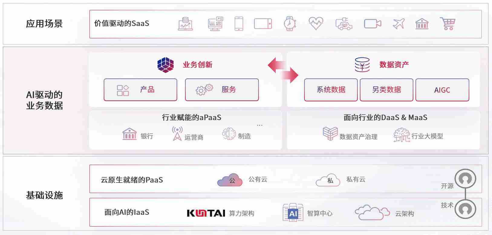 数字时代,,,围绕企业数字化转型的关键要素,,,,开元ky888数码开创性的提出数云融合战略和技术体系框架,,,,着力在云原生、、、数字原生、、、、AI原生和信创产业上架构产品和服务能力,,为处在不同数字化转型阶段的快消零售、、汽车、、、金融、、、、医疗、、、、政企、、、教育、、运营商等行业客户提供泛在的敏捷IT能力和融合的数据驱动能力,,构建跨界融合创新的数字业务场景和新业务模式,,,助力企业级客户建立面向未来的核心能力和竞争优势,,全面推动社会的数字化、、、、智能化转型升级。。。。