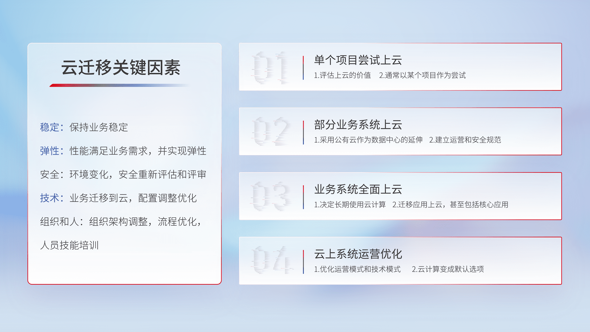结合实际业务,,,,从规划设计、、、云平台选型、、云原生改造、、、、数据迁移、、、、集成交付,,,迁移全过程为客户识别最佳上云路径,,做好风险识别管理,,,,设计网络架构、、、身份权限、、、、安全审计合规、、、操作审计、、、、日志审计、、监控告警策略、、、、多站点容灾设计等,,,对云上基础设施进行整体规划,,,,提升IT治理水平,,,以满足弹性、、高可用、、高性能的需求。。