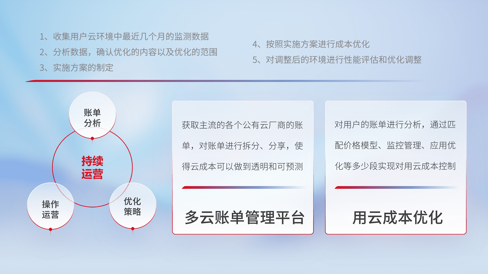 通过多云纳管,,,,以统一的资源数据模型把客户的云资源进行抽象和封装,,进而实现对多云资源的统一操作,,保障云资源管理的可靠性、、、稳定性与可用性。。。量身定制化运维内容,,,,配置、、、开发运维、、补丁管理、、备份、、、监控、、、认证和访问管理、、审计和日常巡检等,,,,保障在用云过程中的可靠度,,,稳定度以及高可用率。。。。